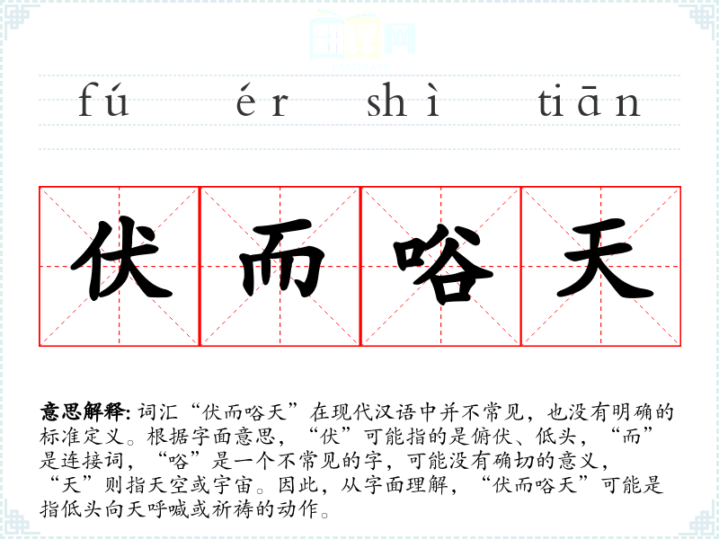 词汇“伏而唂天”在现代汉语中并不常见,也没有明确的标准定义。根据字面意思,“伏”可能指的是俯伏、低头,“而”是连接词,“唂”是一个不常见的字,可能没有确切的意义,“天”则指天空或宇宙。因此,从字面理解,“伏而唂天”可能是指低头向天呼喊或祈祷的动作。