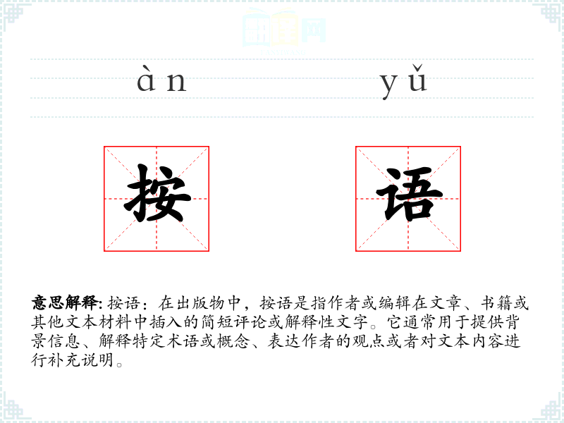 - 口语:在日常对话中,按语的概念可能不常用,但人们可能会在讨论中插入简短的解释或评论。
