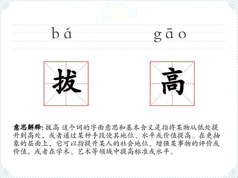 在英语中,“拔高”可以对应为“elevate”或“enhance”,虽然具体含义有所不同,但都表达了提升或增强的意思。