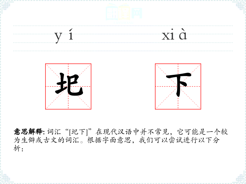 词汇“[圯下]”在现代汉语中并不常见,它可能是一个较为生僻或古文的词汇。根据字面意思,我们可以尝试进行以下分析: