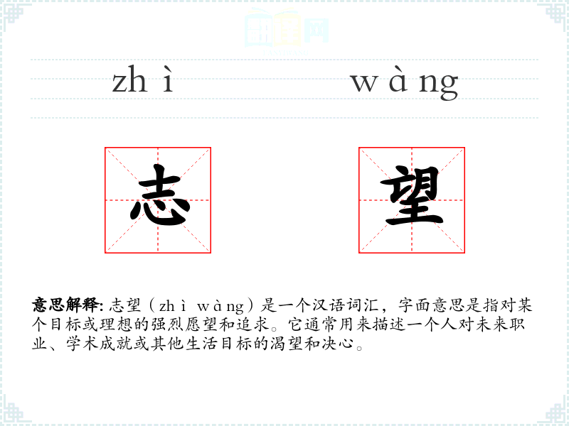 志望(zhì wàng)是一个汉语词汇,字面意思是指对某个目标或理想的强烈愿望和追求。它通常用来描述一个人对未来职业、学术成就或其他生活目标的渴望和决心。