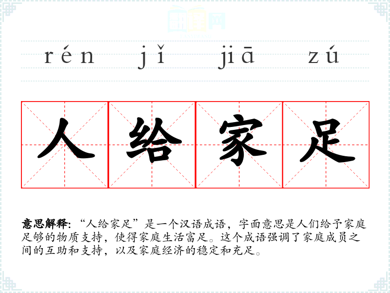 “人给家足”是一个汉语成语,字面意思是人们给予家庭足够的物质支持,使得家庭生活富足。这个成语强调了家庭成员之间的互助和支持,以及家庭经济的稳定和充足。