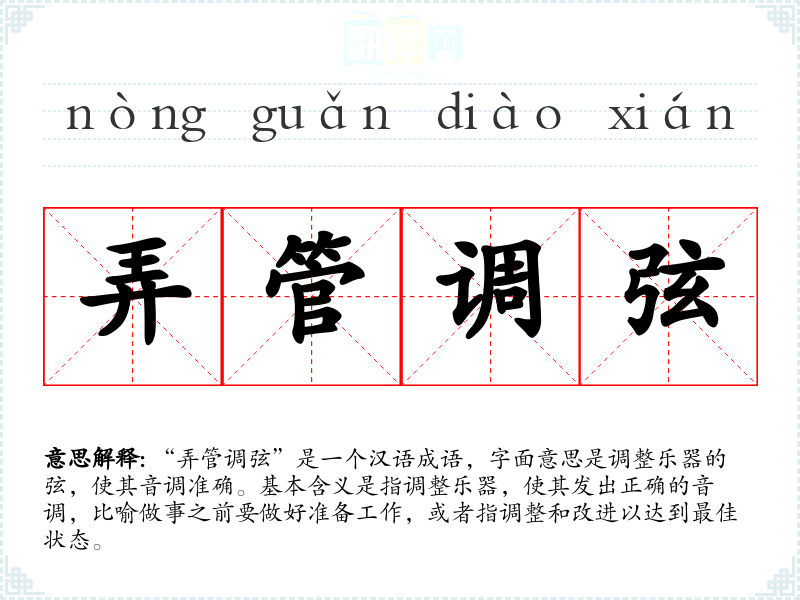 “弄管调弦”是一个汉语成语,字面意思是调整乐器的弦,使其音调准确。基本含义是指调整乐器,使其发出正确的音调,比喻做事之前要做好准备工作,或者指调整和改进以达到最佳状态。