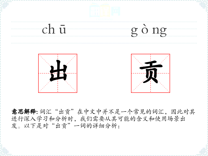 词汇“出贡”在中文中并不是一个常见的词汇,因此对其进行深入学*和分析时,我们需要从其可能的含义和使用场景出发。以下是对“出贡”一词的详细分析: