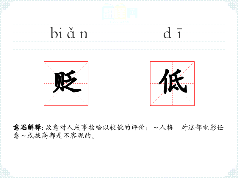 故意对人或事物给以较低的评价:~人格|对这部电影任意~或拔高都是不客观的。