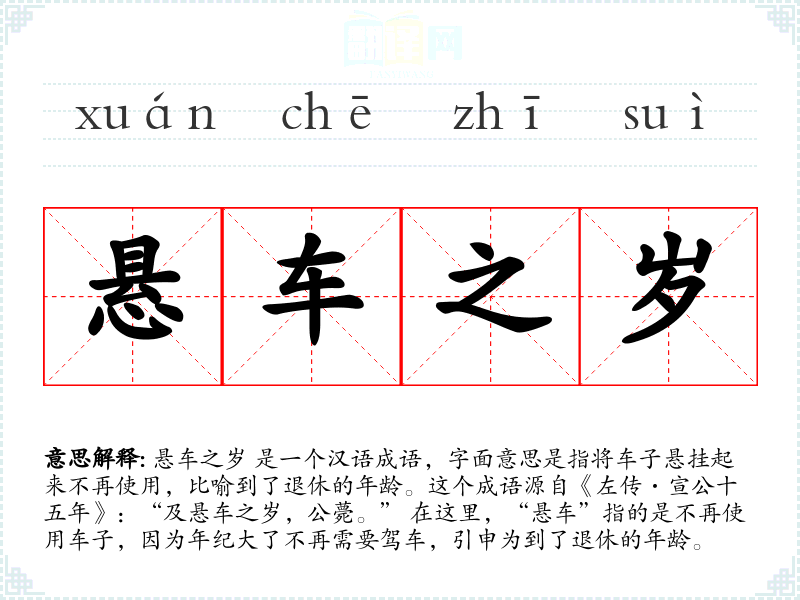 悬车之岁 是一个汉语成语,字面意思是指将车子悬挂起来不再使用,比喻到了退休的年龄。这个成语源自《左传·宣公十五年》:“及悬车之岁,公薨。” 在这里,“悬车”指的是不再使用车子,因为年纪大了不再需要驾车,引申为到了退休的年龄。