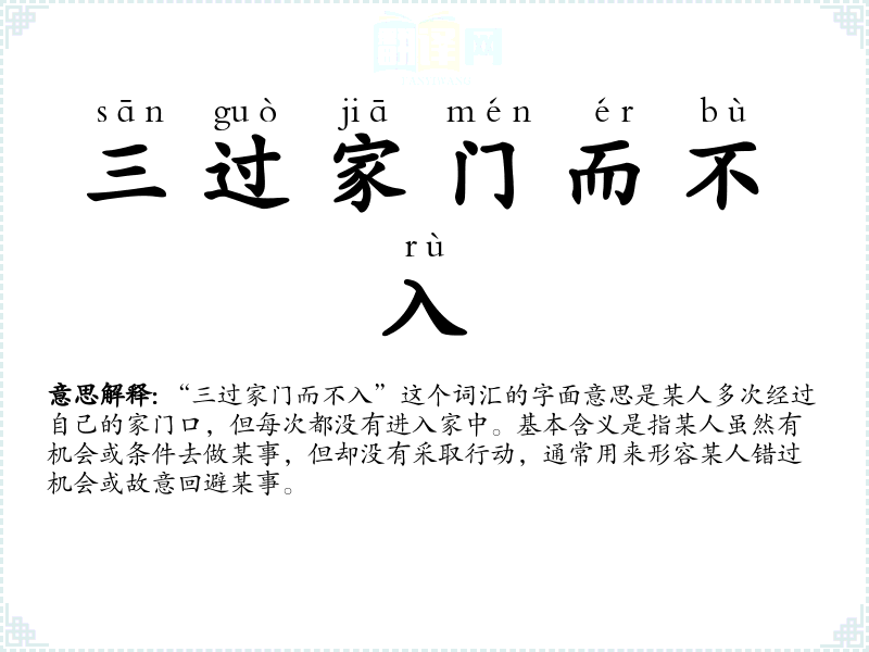“三过家门而不入”这个词汇的字面意思是某人多次经过自己的家门口,但每次都没有进入家中。基本含义是指某人虽然有机会或条件去做某事,但却没有采取行动,通常用来形容某人错过机会或故意回避某事。