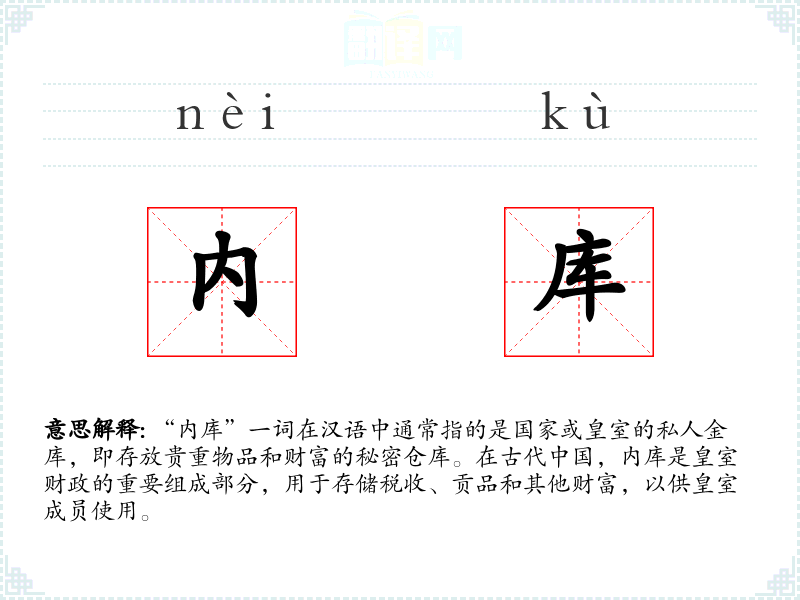 - 专业领域:在财政学或历史学中,内库是一个专业术语,用于研究古代财政制度和皇室经济。