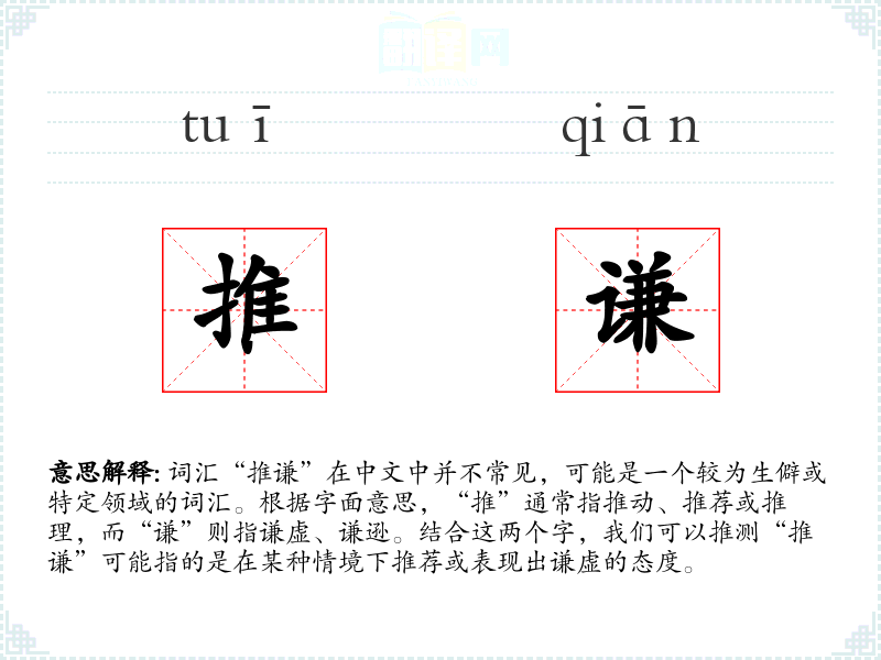 “推谦”的字面意思可能是指在推荐或提出建议时表现出谦虚的态度。然而,由于这个词汇并不常见,确切的定义可能需要参考特定的文献或语境。