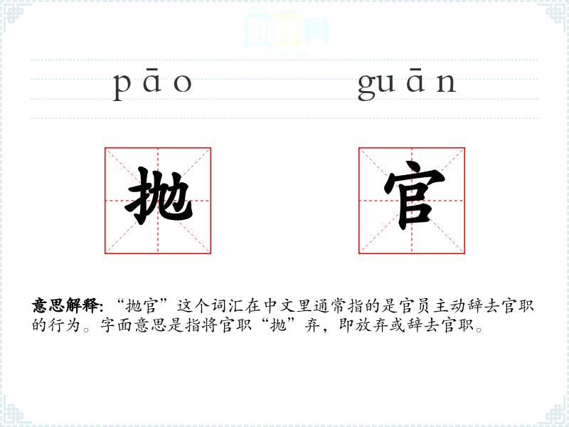 “抛官”这个词汇在中文里通常指的是官员主动辞去官职的行为。字面意思是指将官职“抛”弃,即放弃或辞去官职。