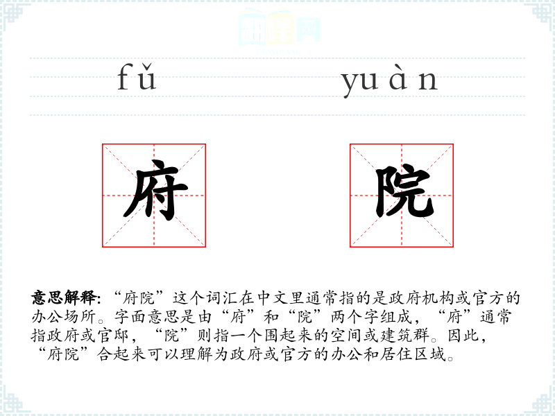 “府院”这个词汇在中文里通常指的是政府机构或官方的办公场所。字面意思是由“府”和“院”两个字组成,“府”通常指政府或官邸,“院”则指一个围起来的空间或建筑群。因此,“府院”合起来可以理解为政府或官方的办公和居住区域。