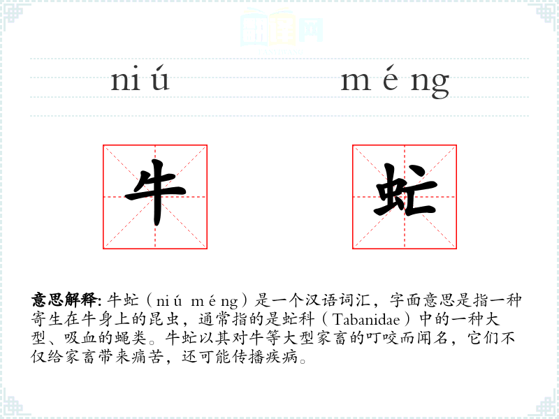 牛虻(niú méng)是一个汉语词汇,字面意思是指一种寄生在牛身上的昆虫,通常指的是虻科(Tabanidae)中的一种大型、吸血的蝇类。牛虻以其对牛等大型家畜的叮咬而闻名,它们不仅给家畜带来痛苦,还可能传播疾病。