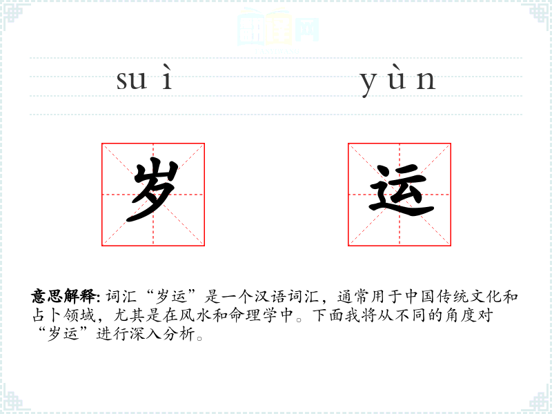 词汇“岁运”是一个汉语词汇,通常用于中国传统文化和占卜领域,尤其是在风水和命理学中。下面我将从不同的角度对“岁运”进行深入分析。