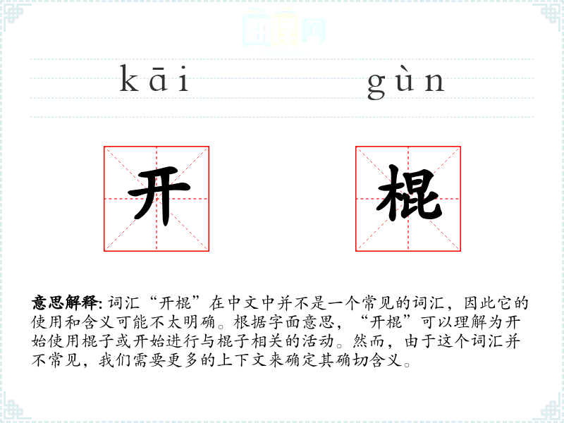 词汇“开棍”在中文中并不是一个常见的词汇,因此它的使用和含义可能不太明确。根据字面意思,“开棍”可以理解为开始使用棍子或开始进行与棍子相关的活动。然而,由于这个词汇并不常见,我们需要更多的上下文来确定其确切含义。