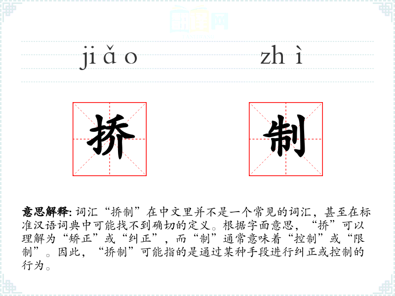 词汇“挢制”在中文里并不是一个常见的词汇,甚至在标准汉语词典中可能找不到确切的定义。根据字面意思,“挢”可以理解为“矫正”或“纠正”,而“制”通常意味着“控制”或“限制”。因此,“挢制”可能指的是通过某种手段进行纠正或控制的行为。