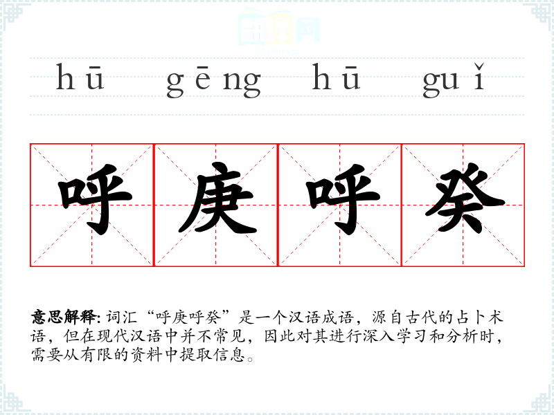 词汇“呼庚呼癸”是一个汉语成语,源自古代的占卜术语,但在现代汉语中并不常见,因此对其进行深入学*和分析时,需要从有限的资料中提取信息。