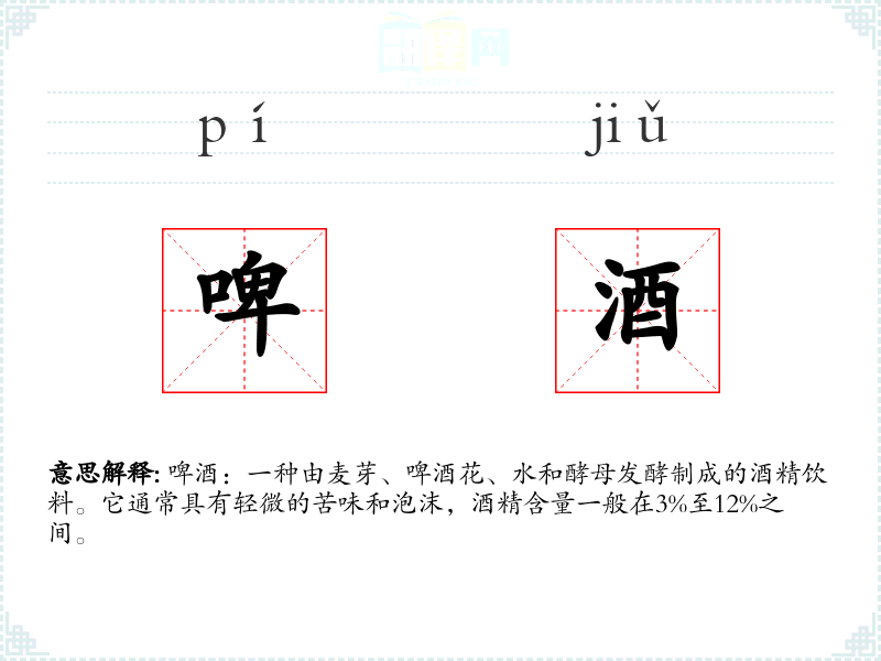 - 同义词:麦酒、生啤、淡啤(根据不同类型和风格)