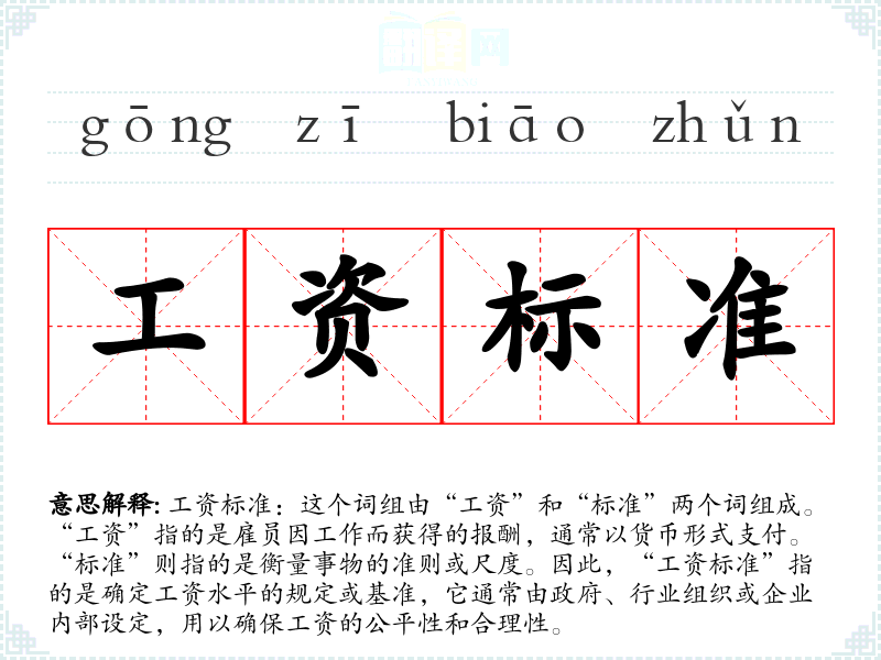 工资标准:这个词组由“工资”和“标准”两个词组成。“工资”指的是雇员因工作而获得的报酬,通常以货币形式支付。“标准”则指的是衡量事物的准则或尺度。因此,“工资标准”指的是确定工资水平的规定或基准,它通常由政府、行业组织或企业内部设定,用以确保工资的公平性和合理性。