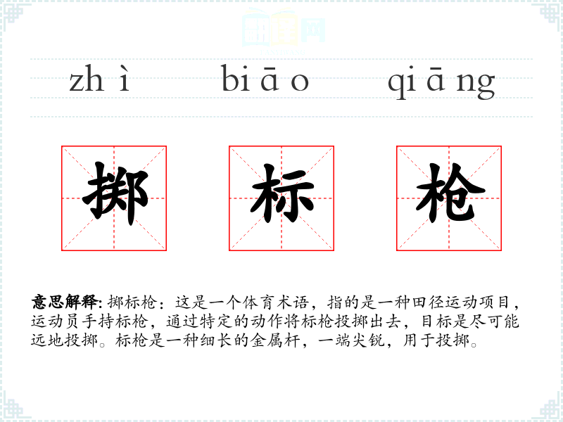 掷标枪:这是一个体育术语,指的是一种田径项目,员手持标枪,通过特定的动作将标枪投掷出去,目标是尽可能远地投掷。标枪是一种细长的金属杆,一端尖锐,用于投掷。