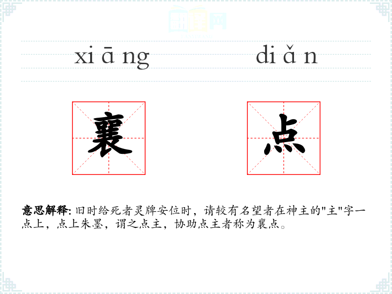 旧时给死者灵牌安位时,请较有名望者在神主的"主"字一点上,点上朱墨,谓之点主,协助点主者称为襄点。
