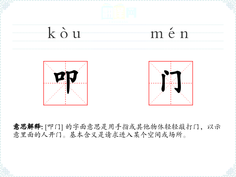 [叩门] 的字面意思是用手指或其他物体轻轻敲打门,以示意里面的人开门。基本含义是请求进入某个空间或场所。