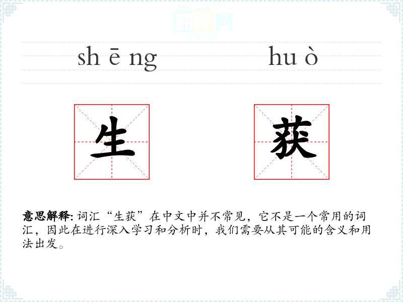 词汇“生获”在中文中并不常见,它不是一个常用的词汇,因此在进行深入学习和分析时,我们需要从其可能的含义和用法出发。