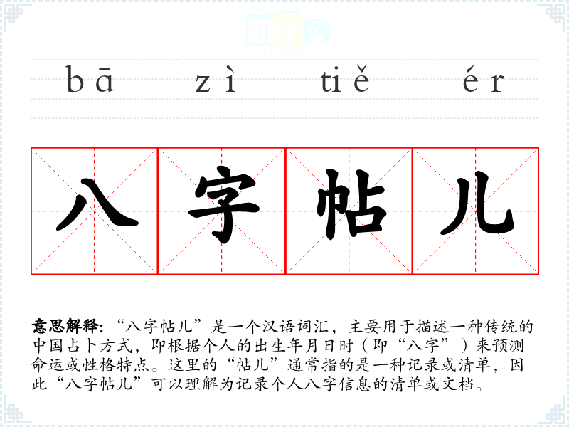 - 专业领域:在命理学或风水学等专业领域,“八字帖儿”是一个专业术语,用于指代详细的个人命理分析。