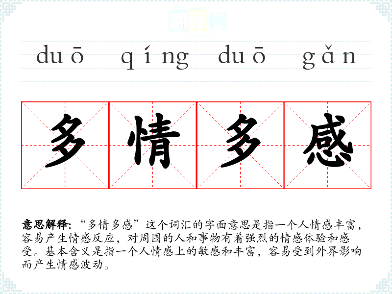 “多情多感”这个词汇的字面意思是指一个人情感丰富,容易产生情感反应,对周围的人和事物有着强烈的情感体验和感受。基本含义是指一个人情感上的敏感和丰富,容易受到外界影响而产生情感波动。