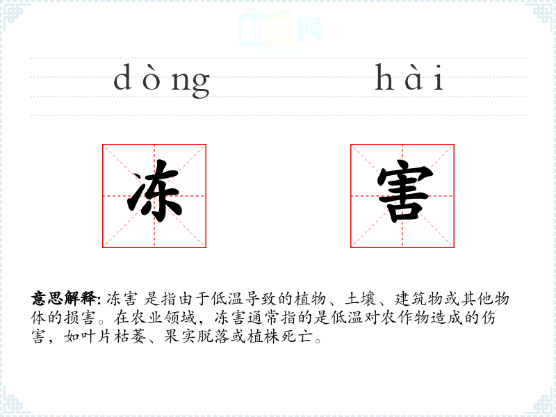 冻害 这个词由“冻”和“害”两个字组成。“冻”指的是因低温而凝固或冻结,“害”指的是损害或伤害。这个词在中文中的使用历史较长,主要在农业和气象学领域中使用。