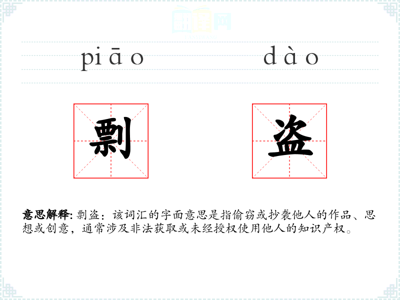 剽盗:该词汇的字面意思是指偷窃或抄袭他人的作品、思想或创意,通常涉及非法获取或未经授权使用他人的知识产权。
