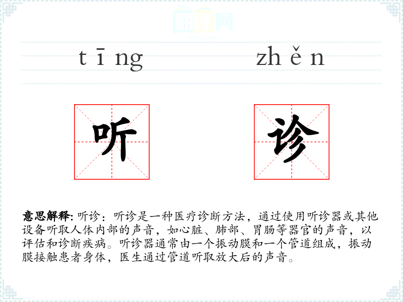 - 同义词:听诊的同义词包括“听音”、“听诊检查”等,但这些词汇在专业性和精确性上可能不如“听诊”。