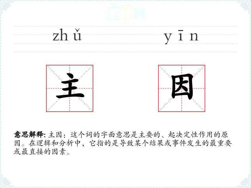 主因:这个词的字面意思是主要的、起决定性作用的原因。在逻辑和分析中,它指的是导致某个结果或**发生的最重要或最直接的因素。