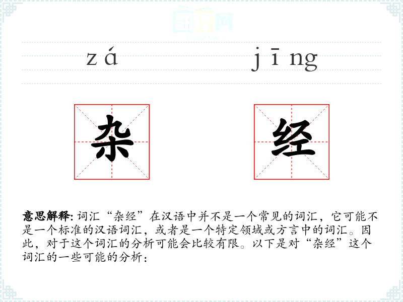 由于“杂经”不是一个常见的词汇,它在不同语境下的使用可能非常有限。在某些特定的**或学术领域,它可能指的是一些非正统的、边缘的文献。