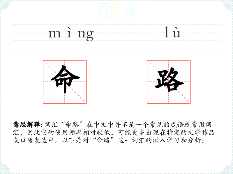 词汇“命路”在中文中并不是一个常见的成语或常用词汇,因此它的使用频率相对较低,可能更多出现在特定的文学作品或口语表达中。以下是对“命路”这一词汇的深入学*和分析: