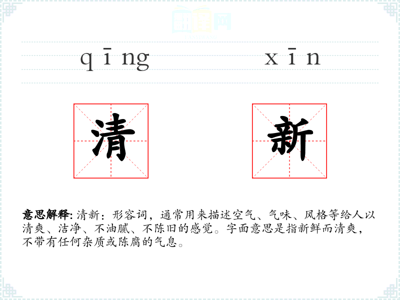 清新:形容词,通常用来描述空气、气味、风格等给人以清爽、洁净、不油腻、不陈旧的感觉。字面意思是指新鲜而清爽,不带有任何杂质或陈腐的气息。