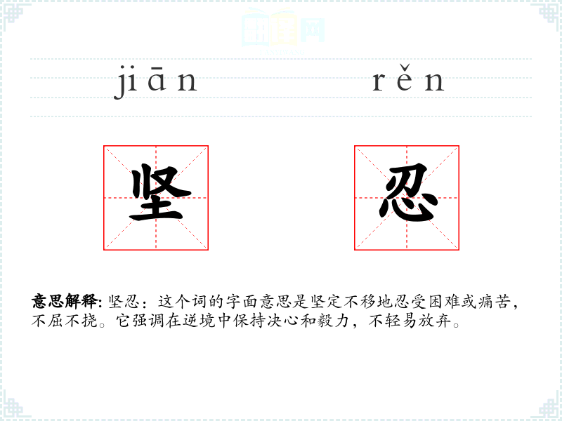 坚忍:这个词的字面意思是坚定不移地忍受困难或痛苦,不屈不挠。它强调在逆境中保持决心和毅力,不轻易放弃。