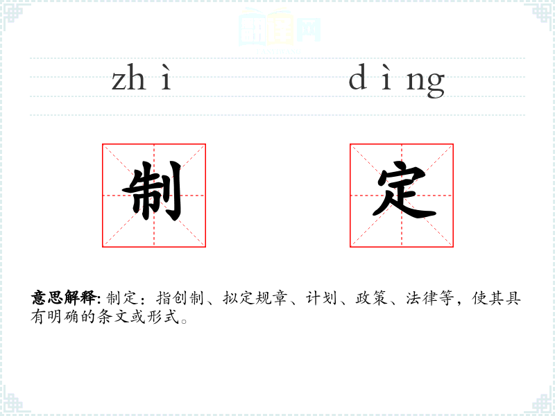 制定:指创制、拟定规章、计划、政策、法律等,使其具有明确的条文或形式。