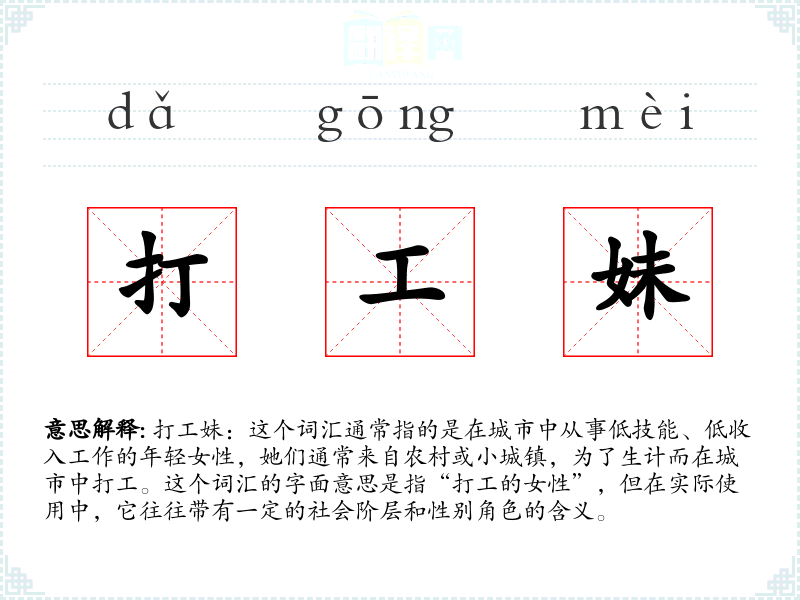 打工妹:这个词汇通常指的是在城市中从事低技能、低收入工作的年轻女性,她们通常来自农村或小城镇,为了生计而在城市中打工。这个词汇的字面意思是指“打工的女性”,但在实际使用中,它往往带有一定的社会阶层和性别角色的含义。