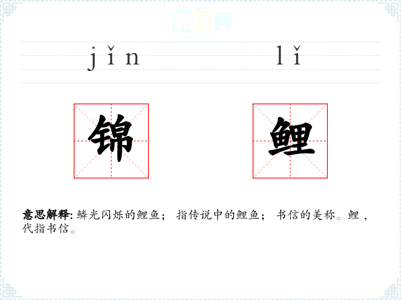 鳞光闪烁的鲤鱼; 指传说中的鲤鱼; 书信的美称。鲤﹐代指书信。