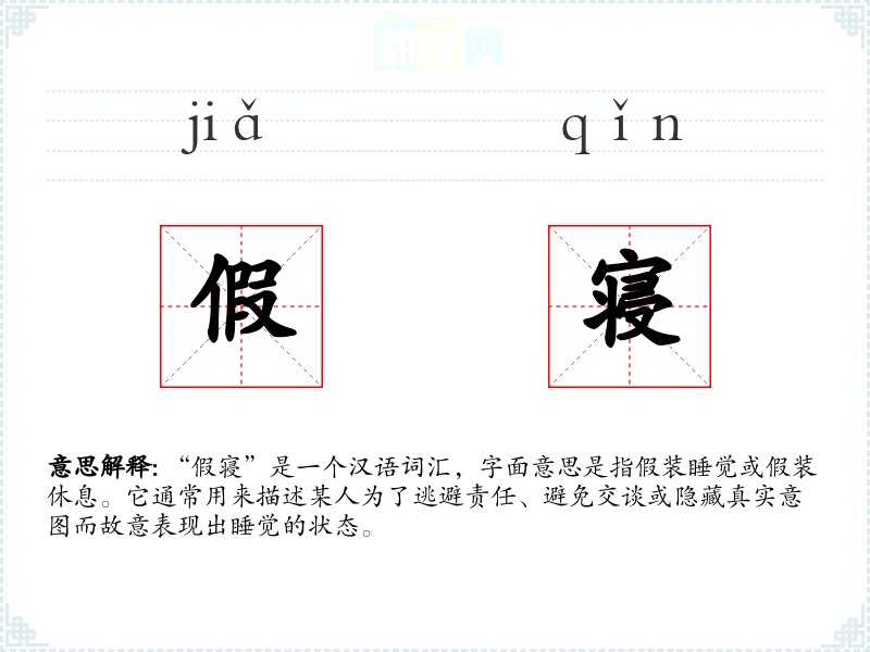 - 口语语境:在日常对话中,人们可能会用“假寝”来形容某人装睡的行为,带有一定的幽默或讽刺意味。