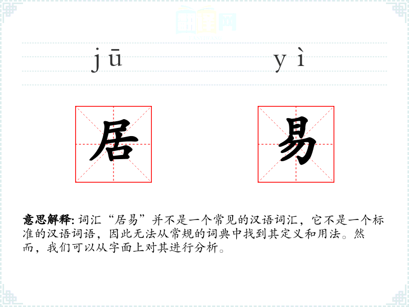 词汇“居易”并不是一个常见的汉语词汇,它不是一个标准的汉语词语,因此无法从常规的词典中找到其定义和用法。然而,我们可以从字面上对其进行分析。