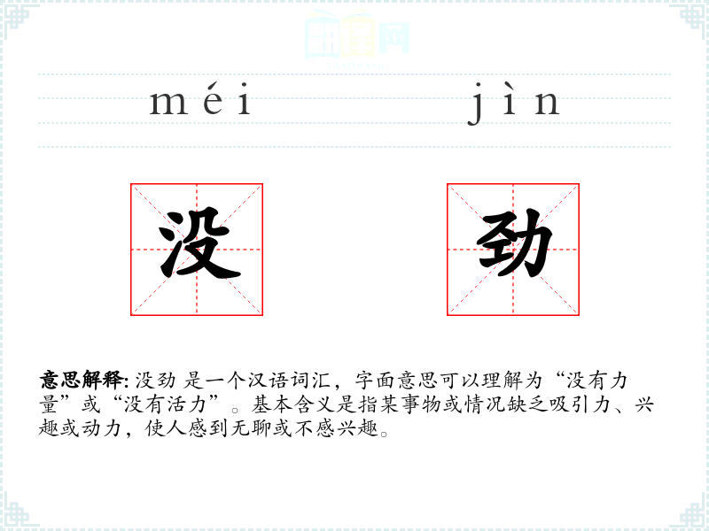 没劲 是一个汉语词汇,字面意思可以理解为“没有力量”或“没有活力”。基本含义是指某事物或情况缺乏吸引力、兴趣或动力,使人感到无聊或不感兴趣。