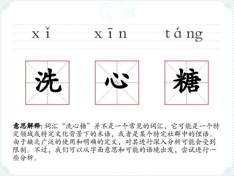 词汇“洗心糖”并不是一个常见的词汇,它可能是一个特定领域或特定文化背景下的术语,或者是某个特定社群中的俚语。由于缺乏广泛的使用和明确的定义,对其进行深入分析可能会受到限制。不过,我们可以从字面意思和可能的语境出发,尝试进行一些分析。