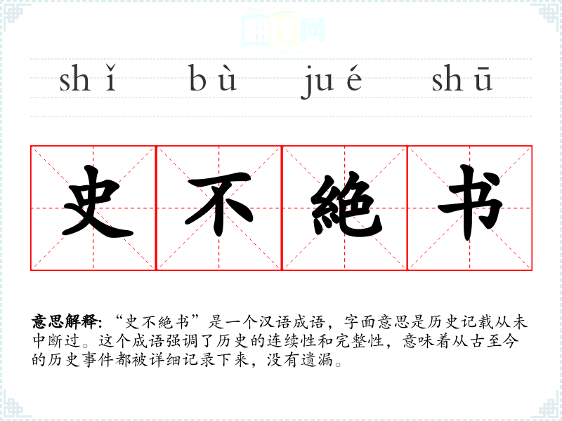 “史不絶书”是一个汉语成语,字面意思是历史记载从未中断过。这个成语强调了历史的连续性和完整性,意味着从古至今的历史**都被详细记录下来,没有遗漏。