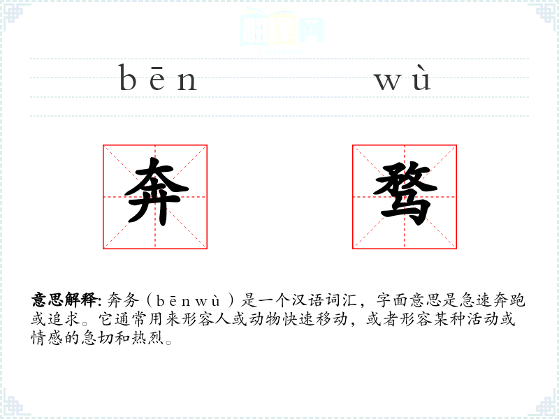 奔务(bēn wù)是一个汉语词汇,字面意思是急速奔跑或追求。它通常用来形容人或动物快速移动,或者形容某种活动或情感的急切和热烈。
