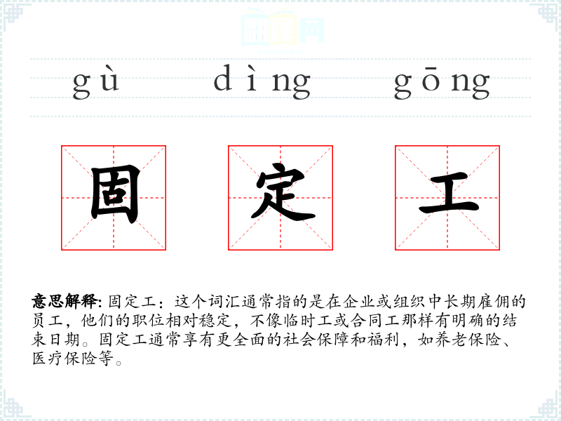 固定工:这个词汇通常指的是在企业或组织中长期雇佣的员工,他们的职位相对稳定,不像临时工或合同工那样有明确的结束日期。固定工通常享有更全面的社会保障和福利,如养老保险、医疗保险等。