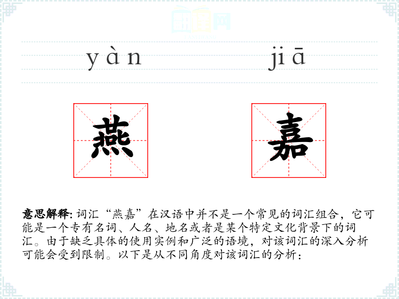 综上所述,由于“燕嘉”不是一个标准词汇,对其的深入分析受到了限制。如果“燕嘉”是一个特定语境下的词汇,那么需要更多的信息和语境来提供准确的分析。