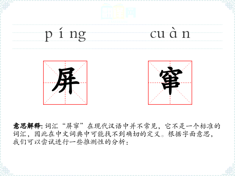 词汇“屏窜”在现代汉语中并不常见,它不是一个标准的词汇,因此在中文词典中可能找不到确切的定义。根据字面意思,我们可以尝试进行一些推测性的分析: