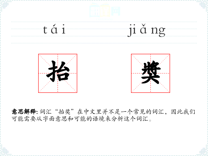 词汇“抬奖”在中文里并不是一个常见的词汇,因此我们可能需要从字面意思和可能的语境来分析这个词汇。