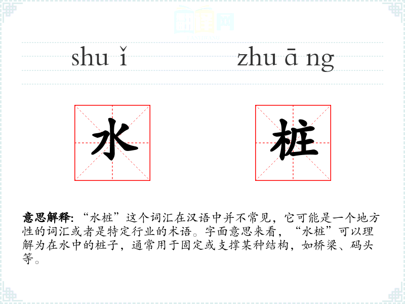 “水桩”这个词汇在汉语中并不常见,它可能是一个地方性的词汇或者是特定行业的术语。字面意思来看,“水桩”可以理解为在水中的桩子,通常用于固定或支撑某种结构,如桥梁、码头等。